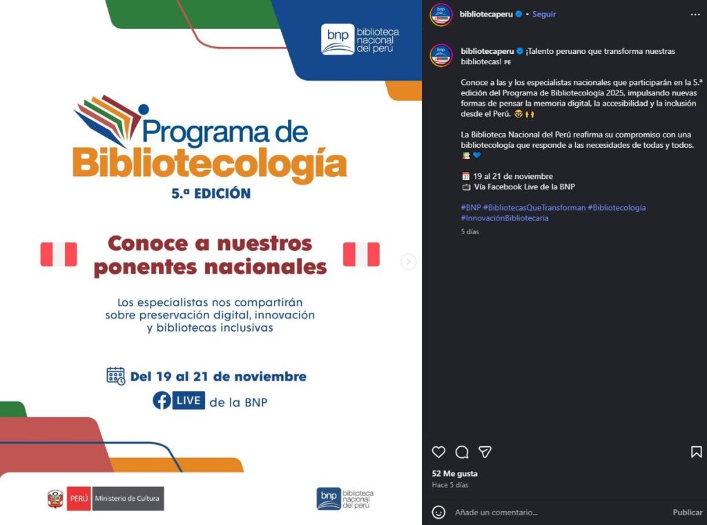La Biblioteca Nacional del Perú (BNP) el dia 19 de noviembre inició con la quinta edición de su Programa de Bibliotecología, un evento académico, virtual y que lleva por título “Bibliotecas que transforman: el futuro de las bibliotecas empieza contigo”, con el objetivo de impulsar la actualización profesional y el debate sobre los desafíos de hoy en el mundo bibliotecario. Este evento fue compartido por las redes sociales del BNP