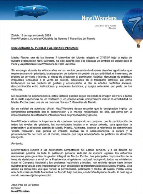 NEW7WONDER envió un documento advirtiendo que prioricen a Machu Pichu en alerta máxima